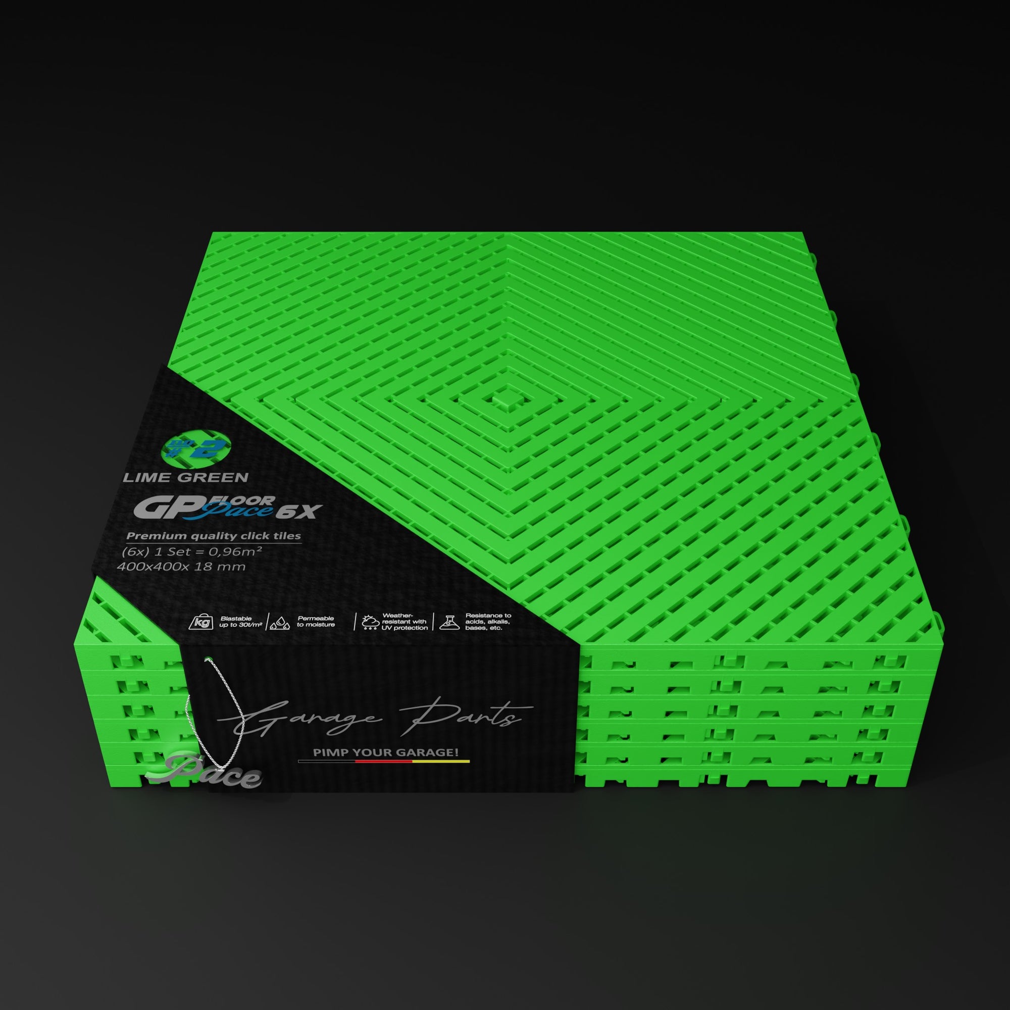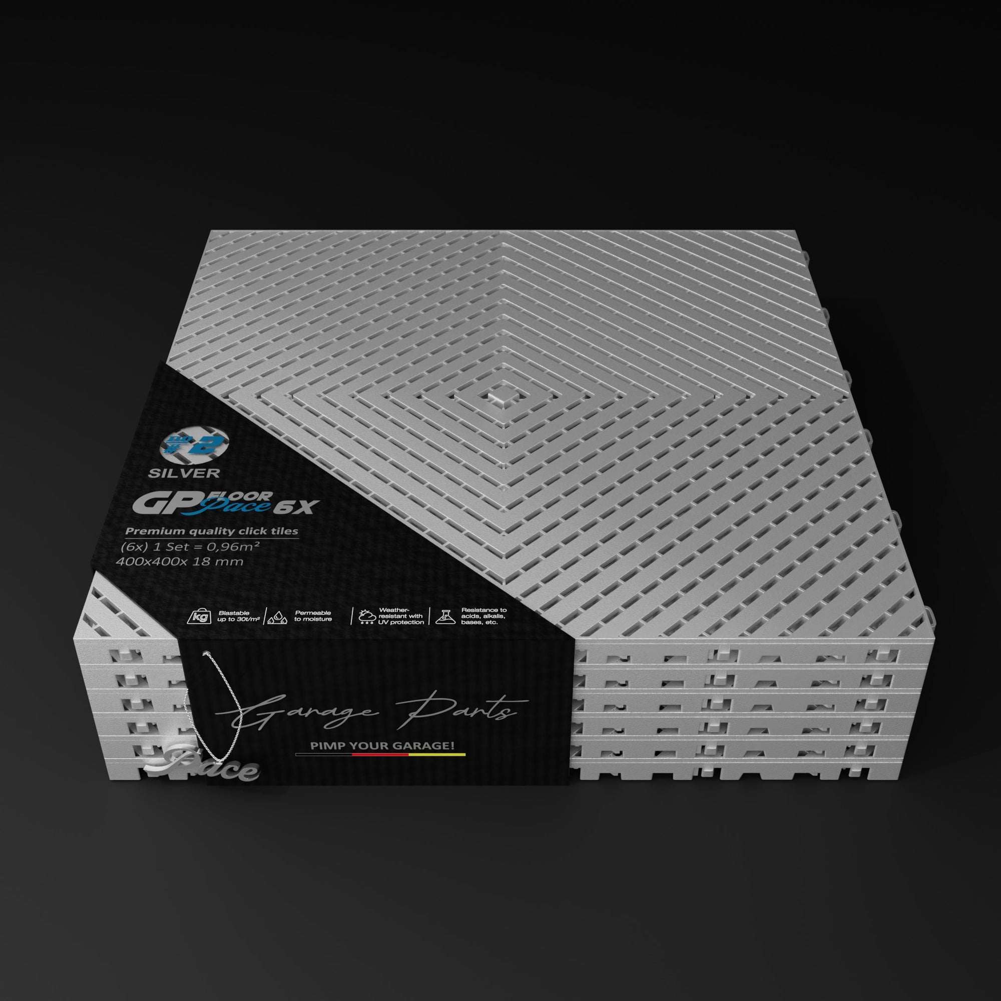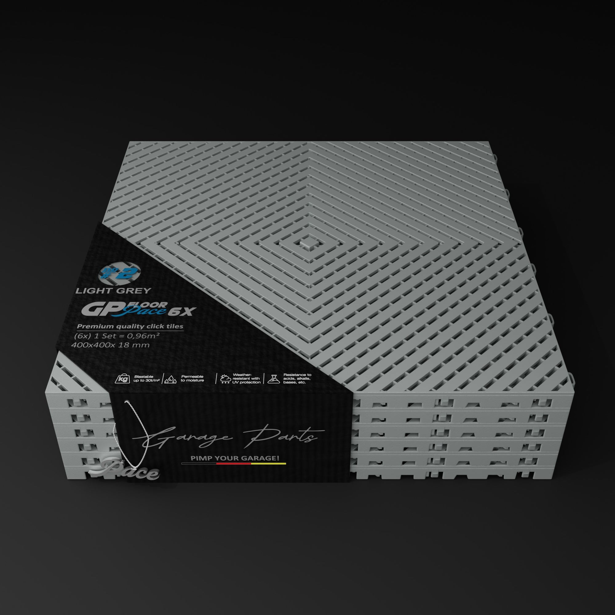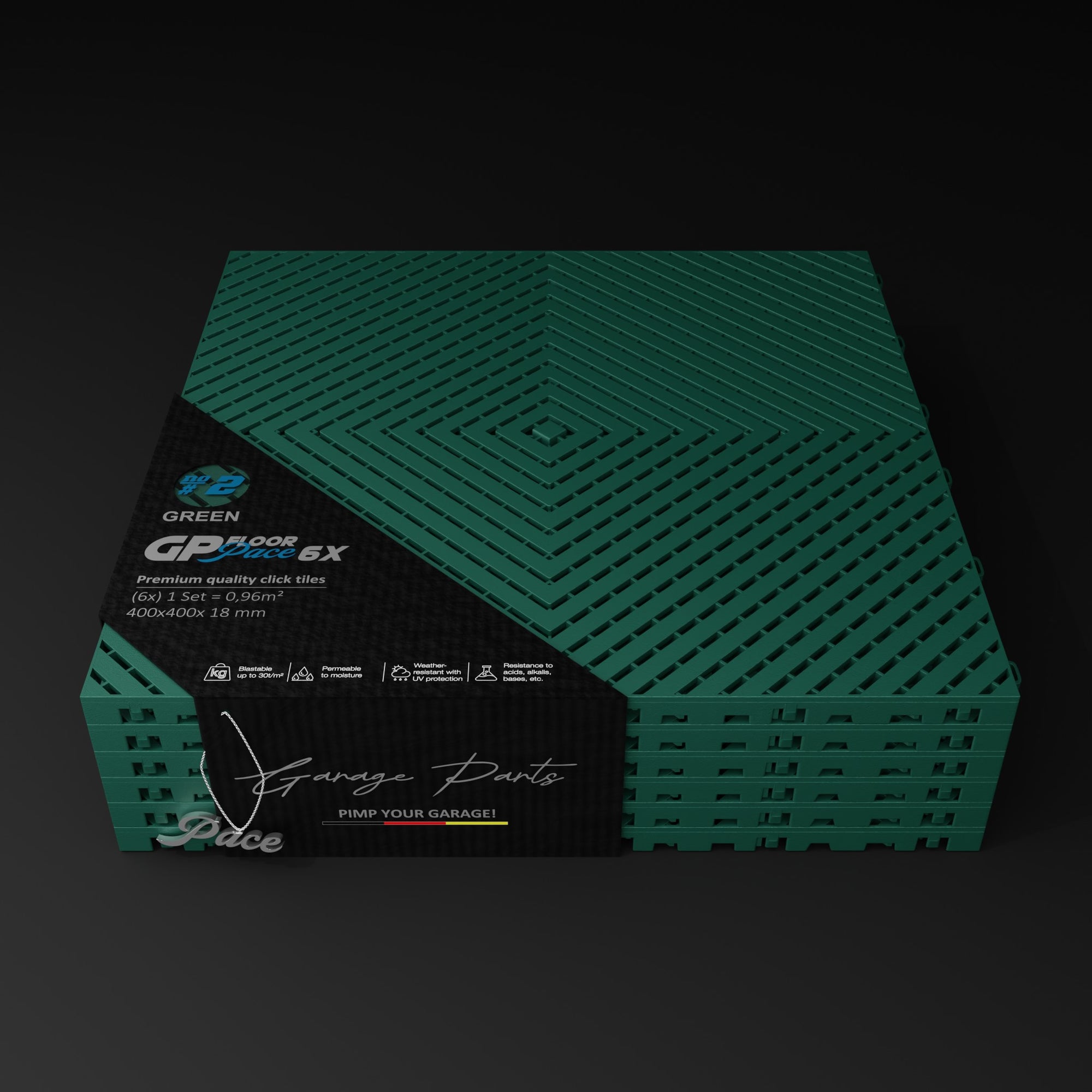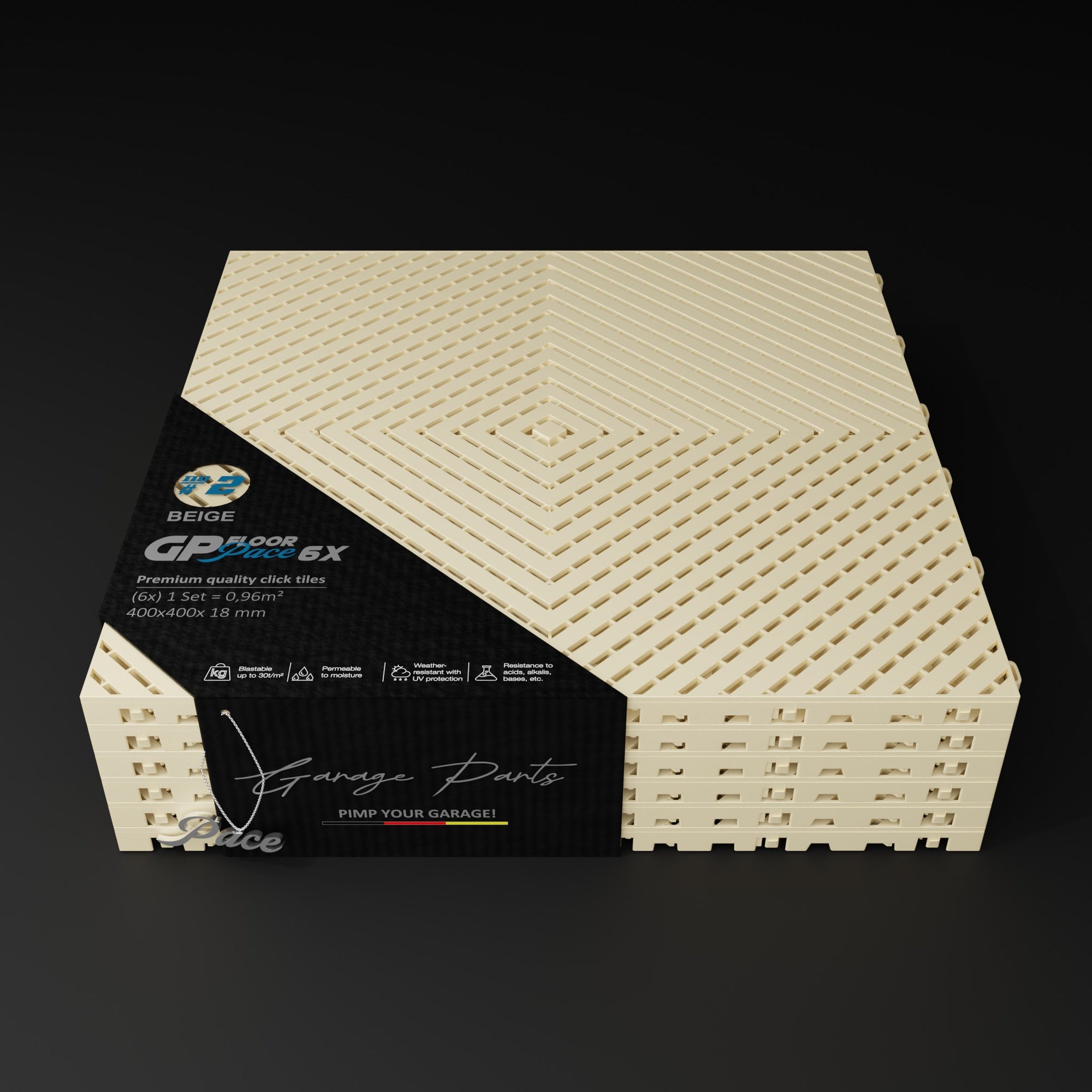 The Pace #1 model offers a unique advantage: Water dripping from a vehicle, for example, doesn't dry on the tile surfaces but is channeled through the tiles and allowed to dry underneath. This allows for excellent air circulation.